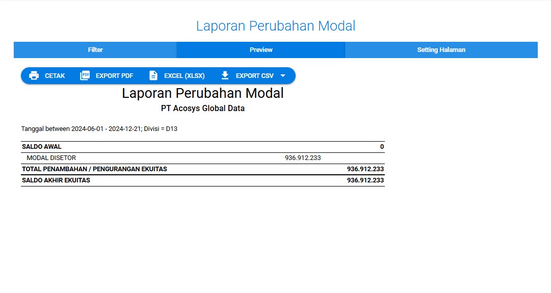 Laporan perubahan ekuitas, atau yang sering disebut juga laporan perubahan modal, adalah laporan keuangan yang menunjukkan perubahan dalam akun ekuitas perusahaan selama periode waktu tertentu. Ekuitas sendiri mewakili nilai kepemilikan dalam perusahaan, yang berasal dari investasi pemilik dan laba yang ditahan. Laporan perubahan ekuitas adalah laporan keuangan yang penting untuk memahami bagaimana modal usaha berubah dan dikelola. Laporan ini memberikan informasi yang berharga bagi berbagai pihak, baik internal maupun eksternal perusahaan, untuk mengevaluasi kinerja keuangan, mengambil keputusan, dan memastikan transparansi dan akuntabilitas.